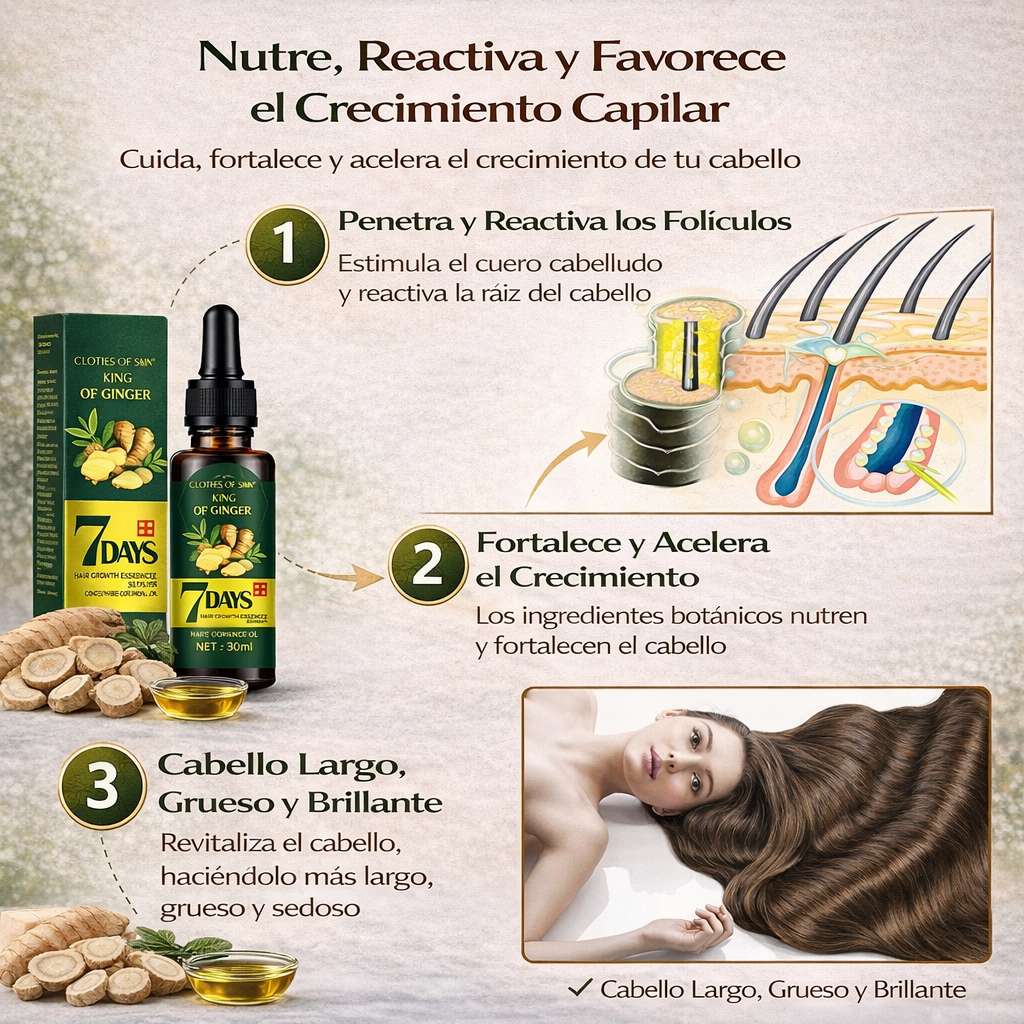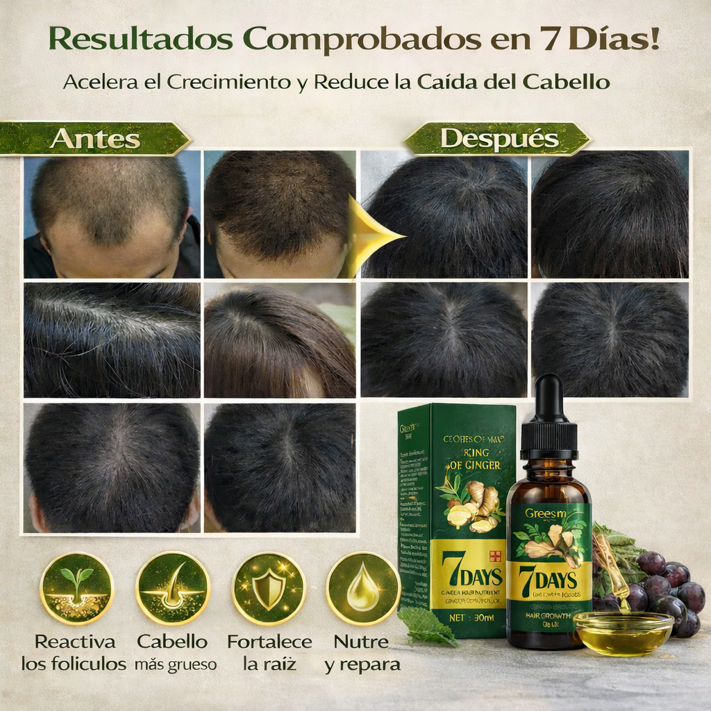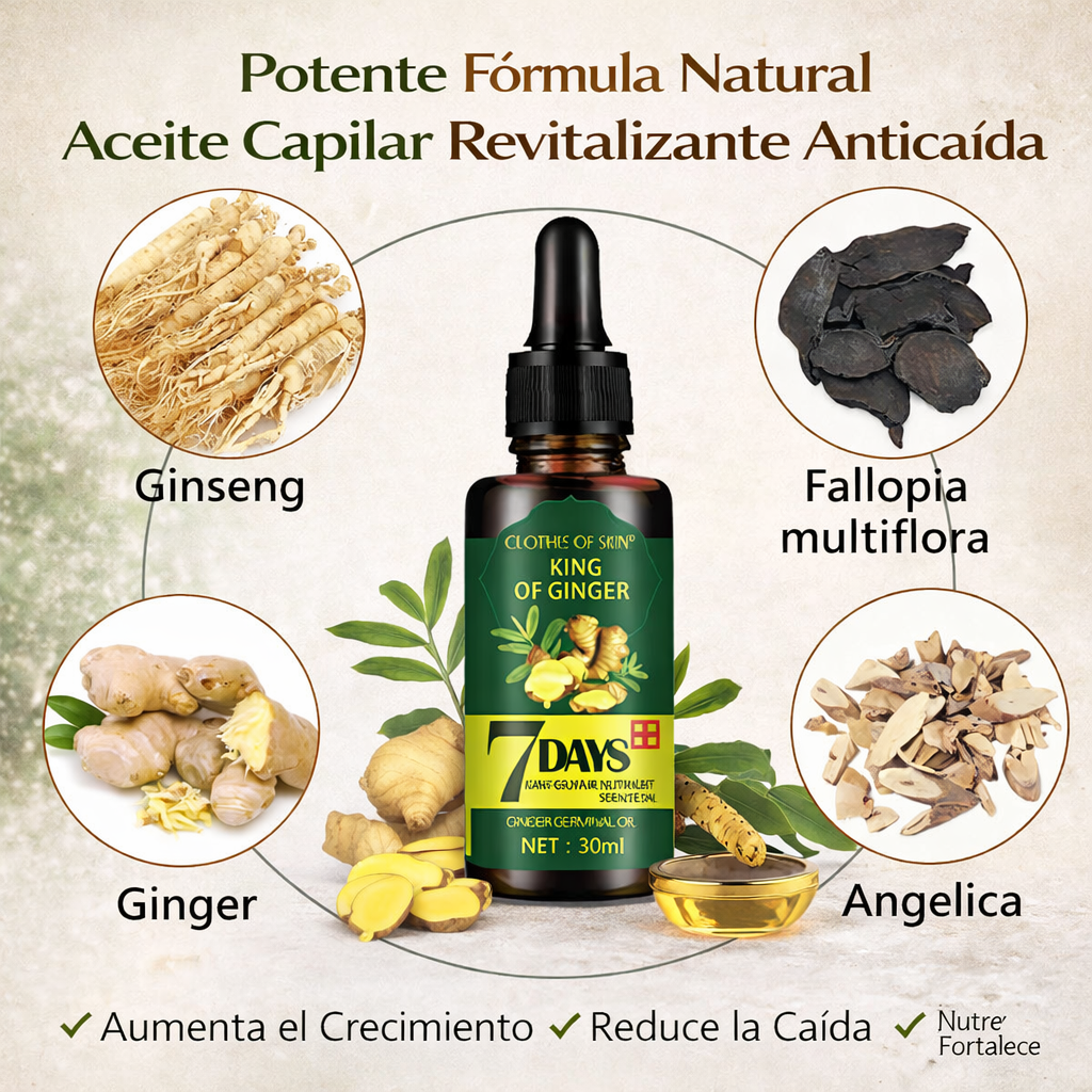 Con cada aplicación, el Aceite de Jengibre trabaja para estimular la circulación del cuero cabelludo, lo que puede ayudar a despertar folículos inactivos y a sostener el surgimiento de cabello nuevo en tan solo una semana 🌟👑. Mientras tanto, el Ginseng, conocido por sus propiedades revitalizantes, contribuye a mejorar la densidad capilar, aportando cuerpo y vida a tu melena. El Aceite de Semilla de Uva, rico en antioxidantes, se absorbe con facilidad para reparar y proteger el cabello dañado, dejándolo suave, liso y lleno de brillo 💫.
