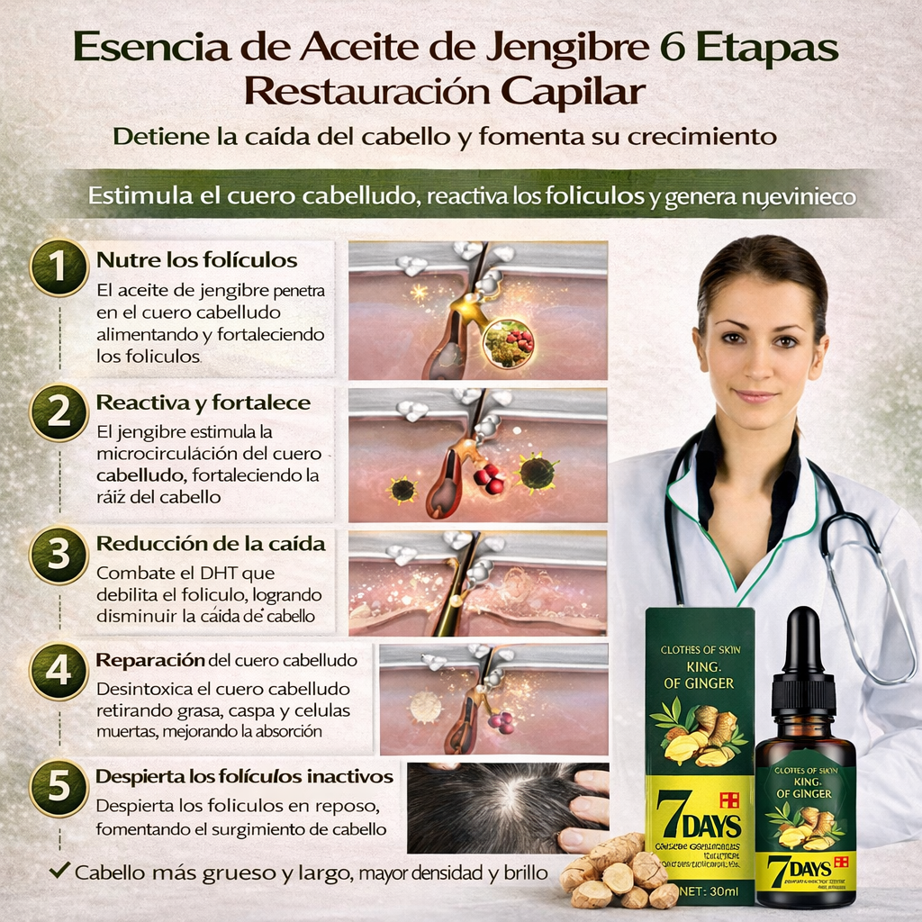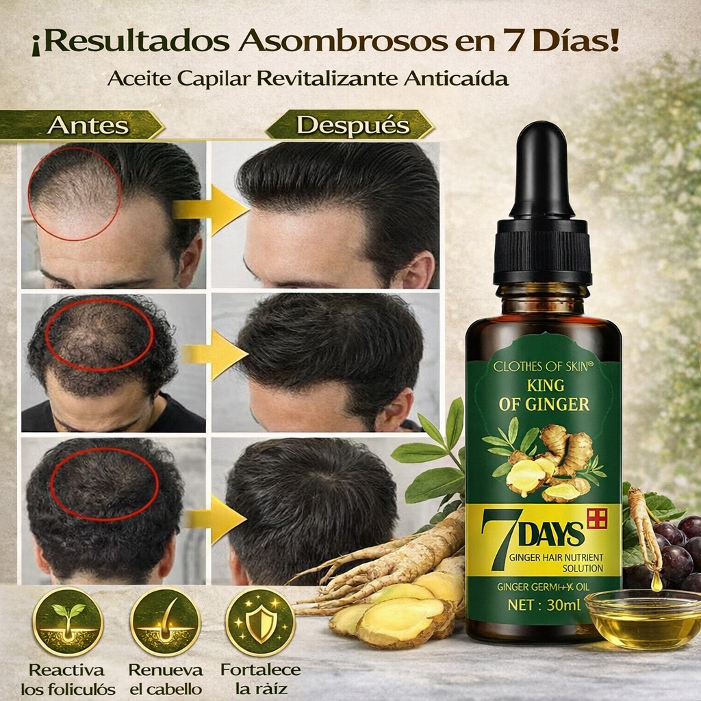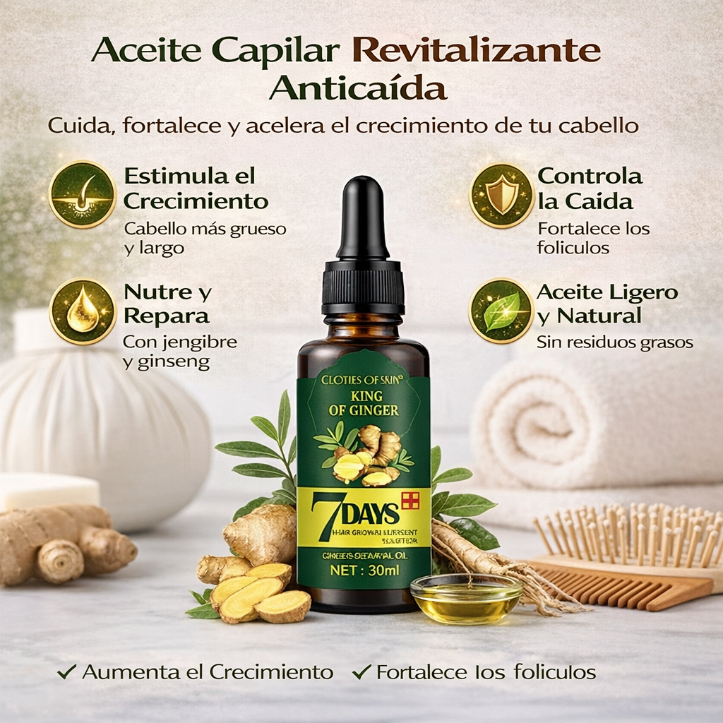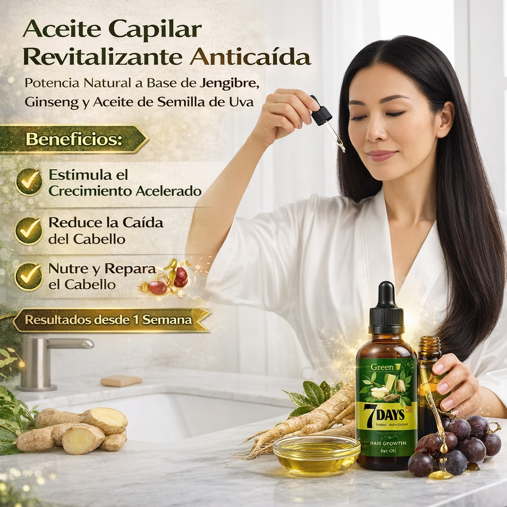 Con cada aplicación, el Aceite de Jengibre trabaja para estimular la circulación del cuero cabelludo, lo que puede ayudar a despertar folículos inactivos y a sostener el surgimiento de cabello nuevo en tan solo una semana 🌟👑. Mientras tanto, el Ginseng, conocido por sus propiedades revitalizantes, contribuye a mejorar la densidad capilar, aportando cuerpo y vida a tu melena. El Aceite de Semilla de Uva, rico en antioxidantes, se absorbe con facilidad para reparar y proteger el cabello dañado, dejándolo suave, liso y lleno de brillo 💫.