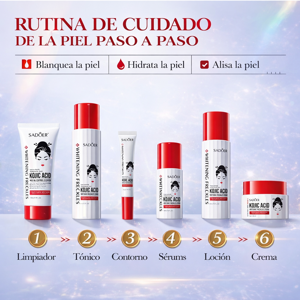 ✨ Ilumina, unifica y mejora el tono de tu piel con una rutina completa de cuidado facial formulada con Ácido Kójico, ideal para ayudar a reducir manchas, pecas y tono disparejo de forma progresiva.